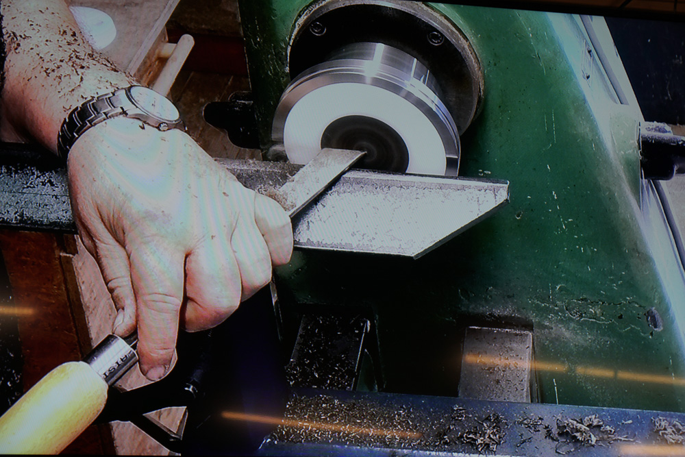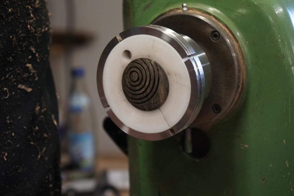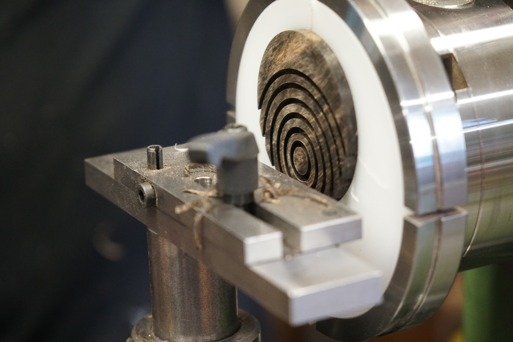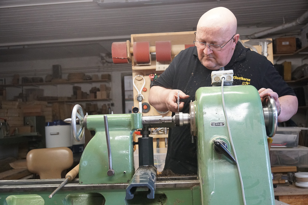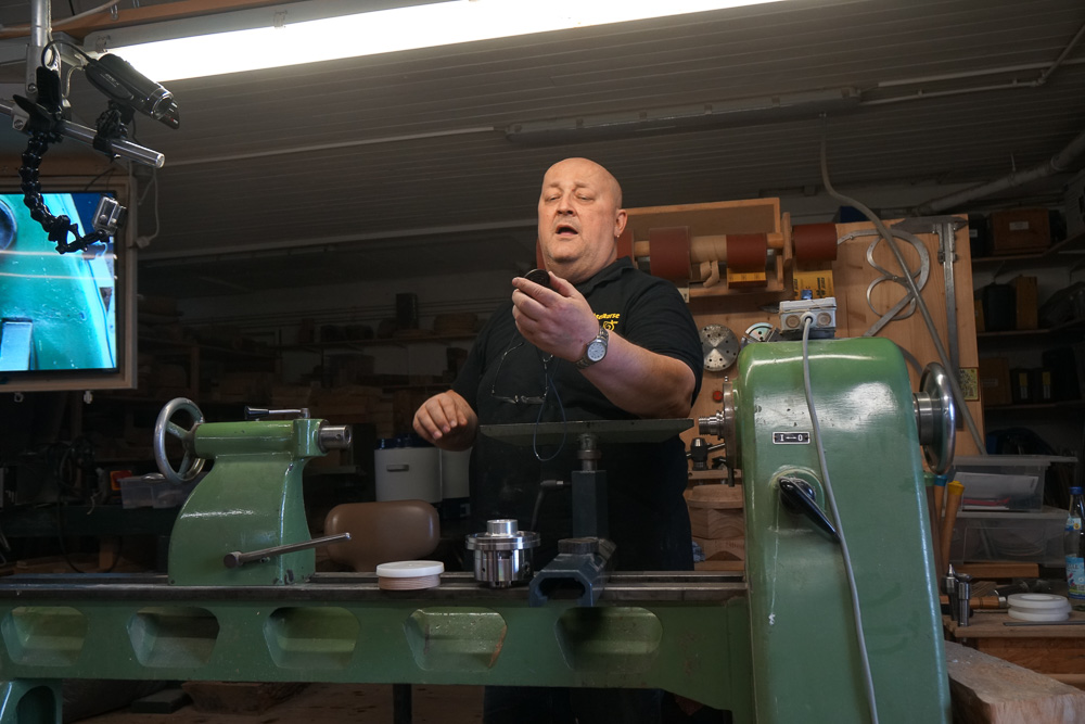 Martin beginnt mit der exzentrisch gedrechselten Seite. Dann ist es später auf der Rückseite leichter. |