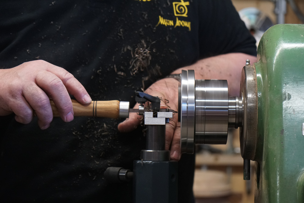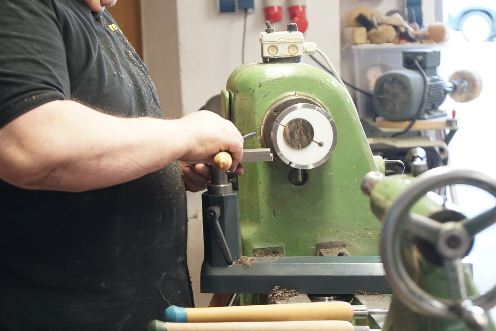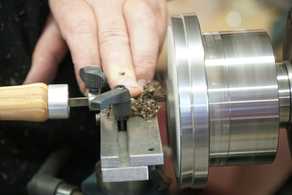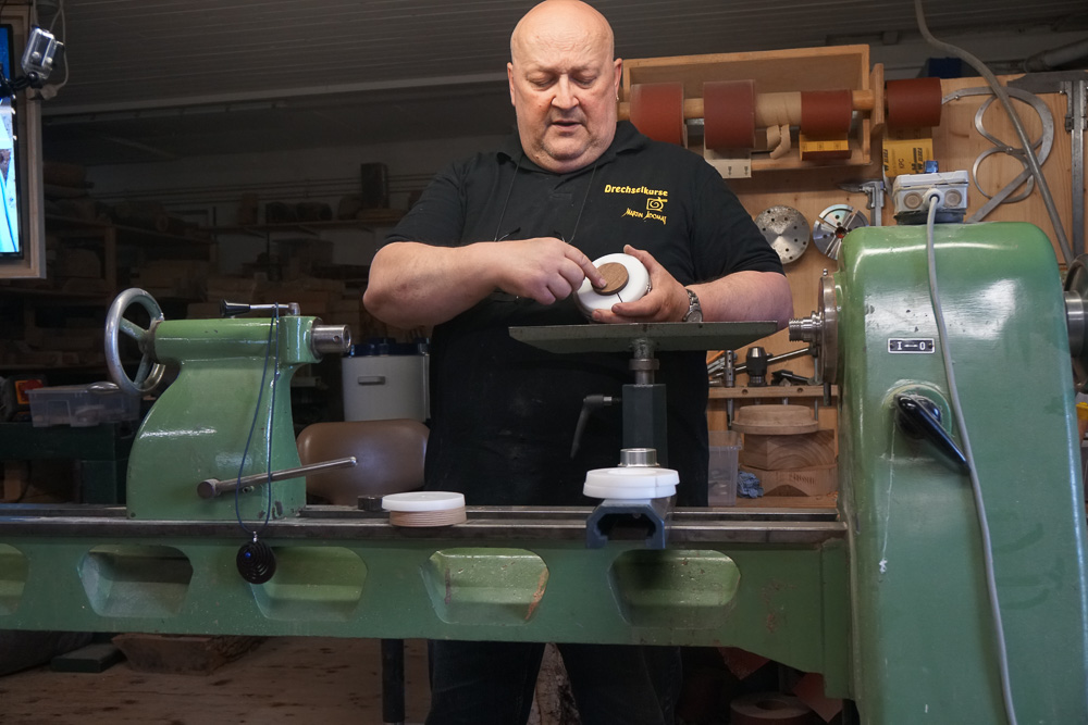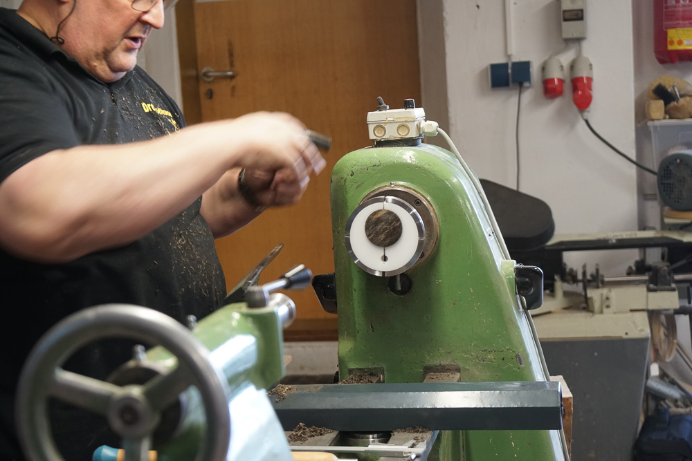 Martin drechselt den Rohling und prüft immer wieder das genaue Maß. |