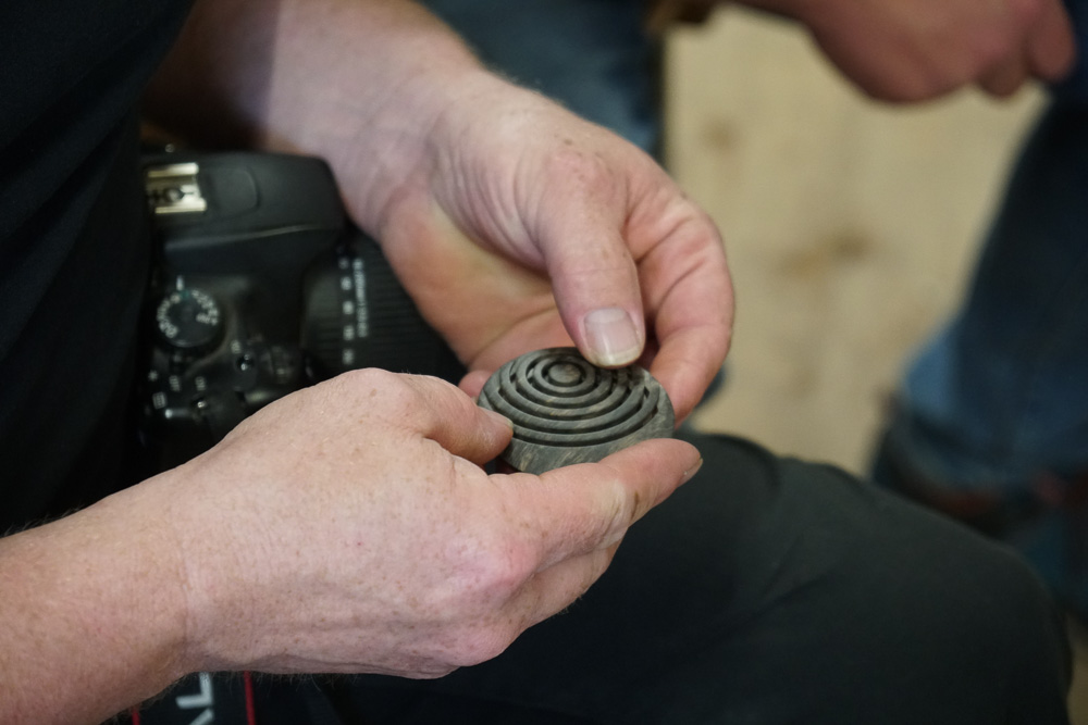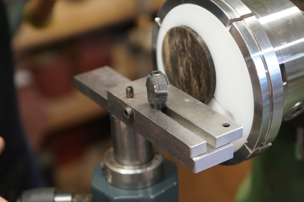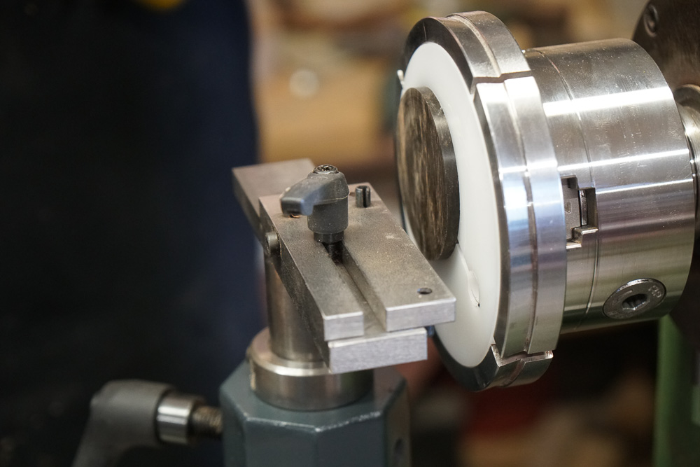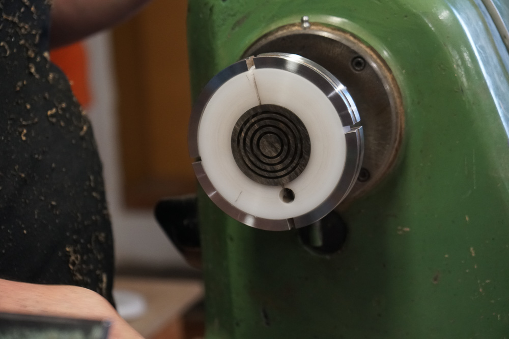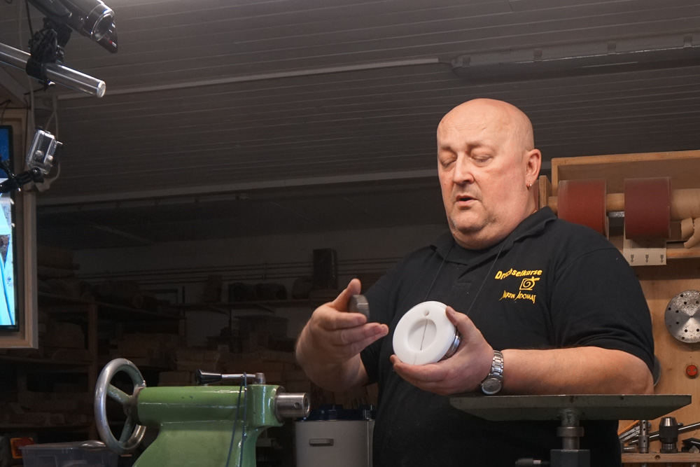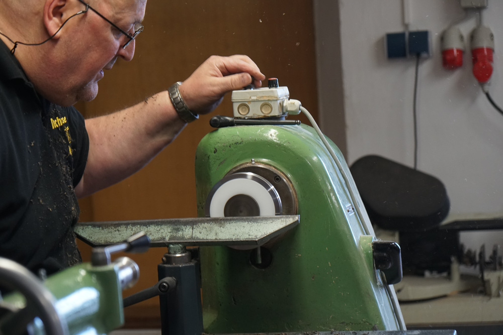 Martin drechselt den Rohling und prüft immer wieder das genaue Maß. |