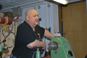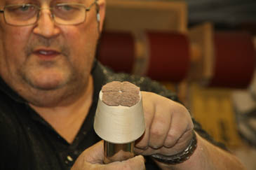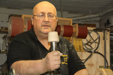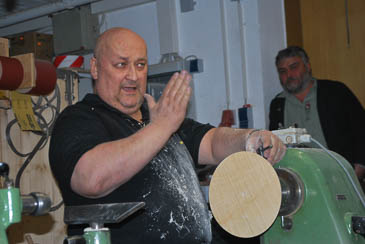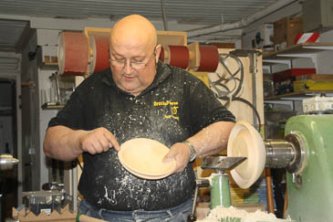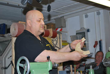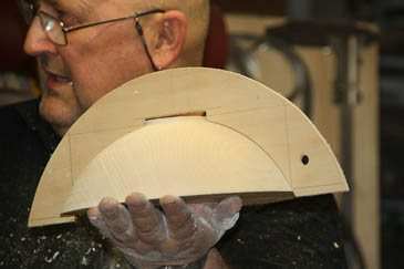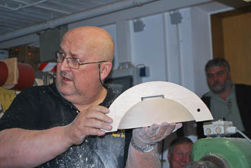 Präzision, Präzision, Präzision - sonst wird das nichts. Selbst die Schablone, die Martin hier zeigt, hat er nicht an der Bandsäge ausgesägt sondern als Ring gedrechselt. Nur so ist die Schablone absolut rund. |