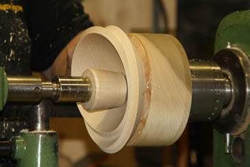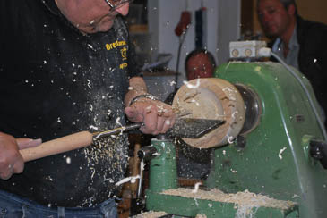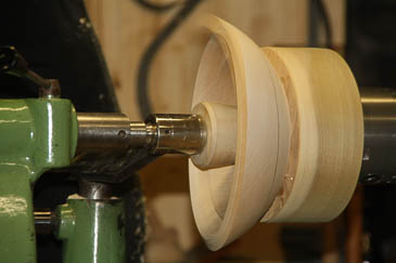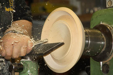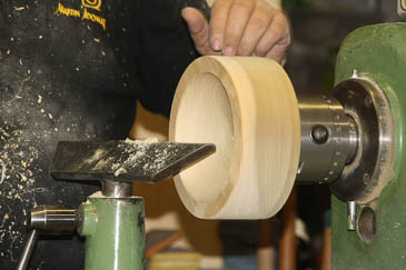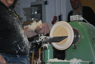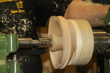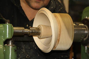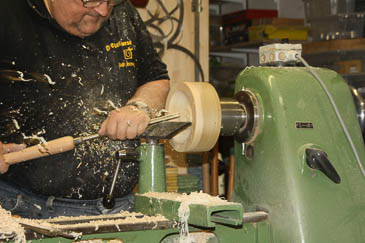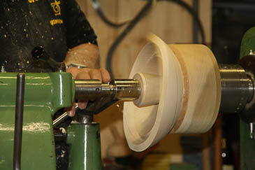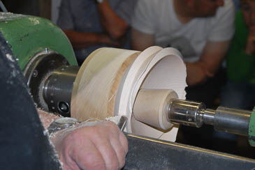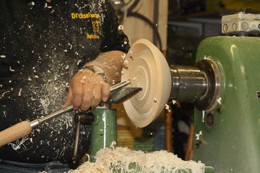 Doch zuerst geht es darum, den Rohling in Form zu bringen. Martin hat ein Stück Ahorn aufgespannt. Auf dem Schraubenfutter wird die Außenform mit Zapfen gedrechselt. |
