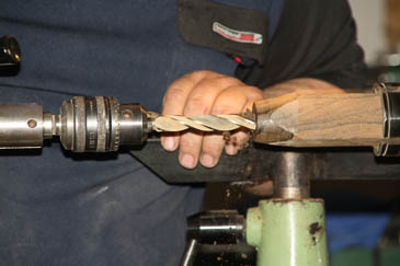 Mit Hilfe des Reitstocks und einer Metallscheibe wird der Einsatz in das vorher gebohrte Loch eingepresst. |
