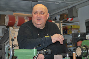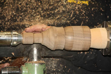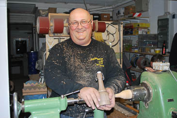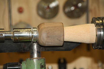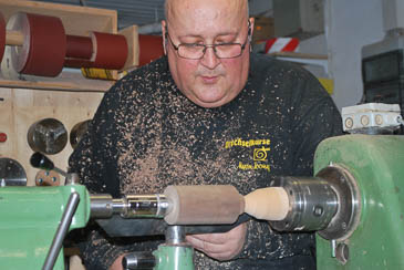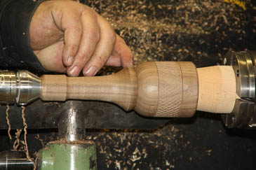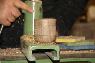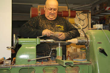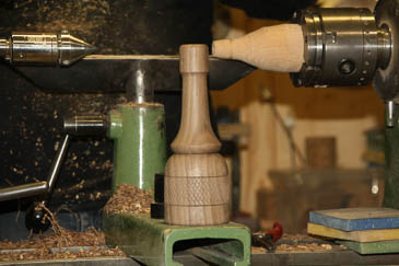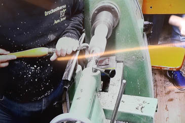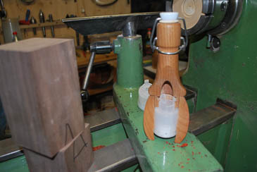 Links die Kantel für die Mühle, die nun gedrechselt wird.
