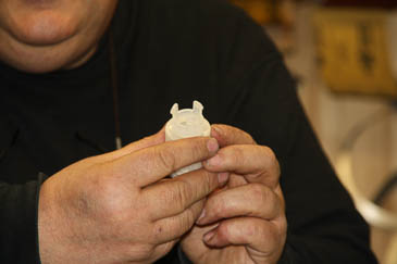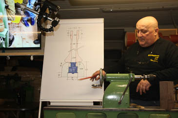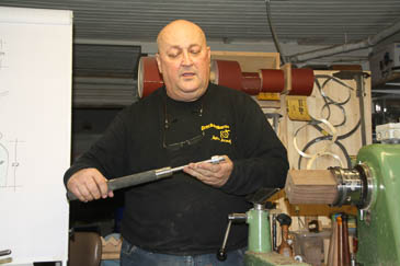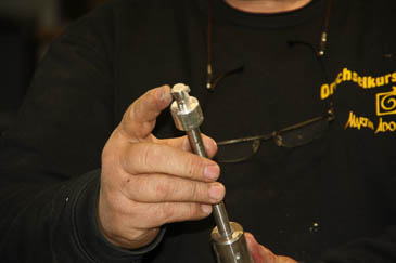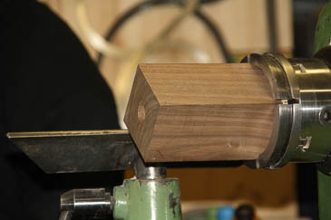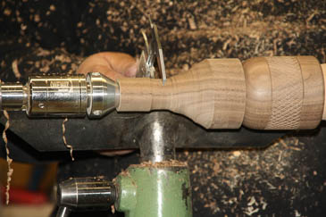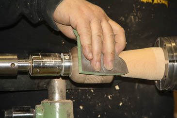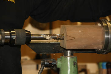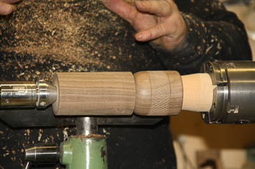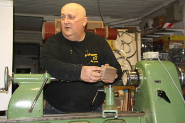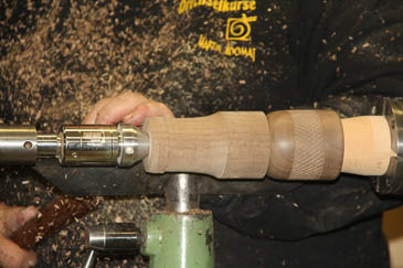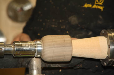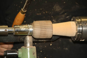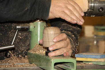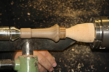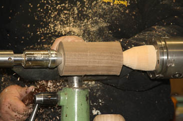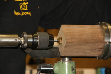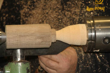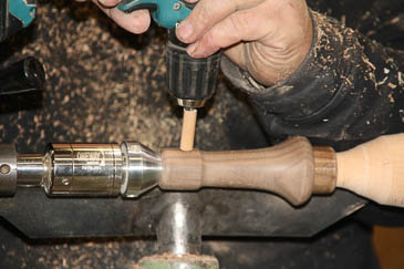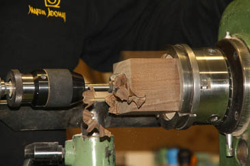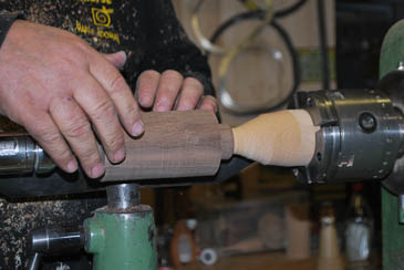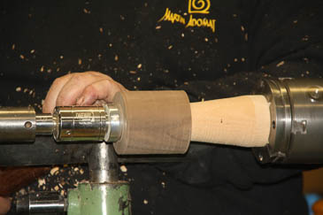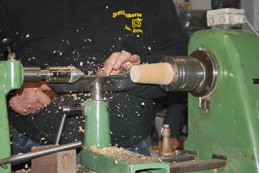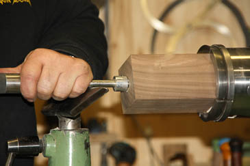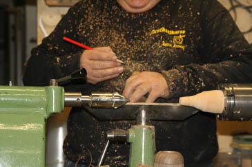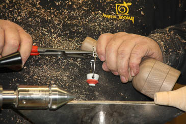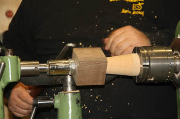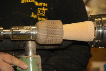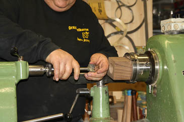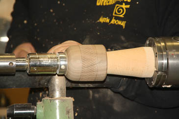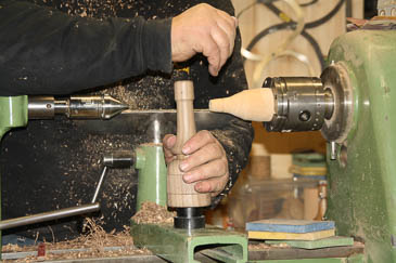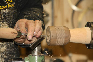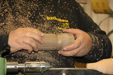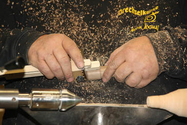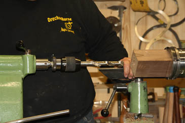 Martin fertigt dazu ein Hilfsholz, das das Unterteil aufnimmt. Von der Reitstockseite wird mit einer größeren Spitze dagegen gehalten. |