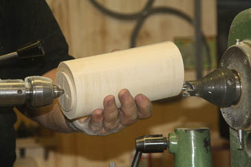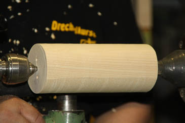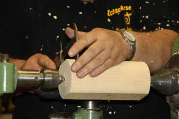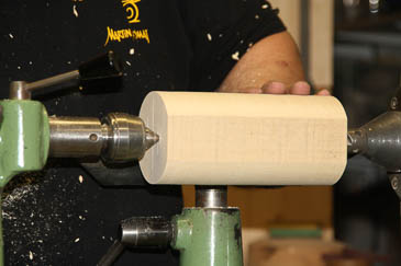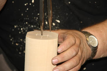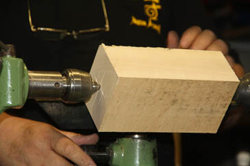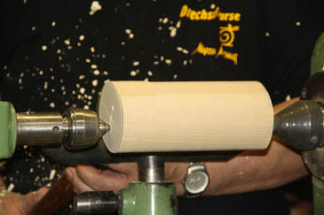 Bevor die "Eckchen" durch Versetzen auf die außen liegenden Punkte weggedrechselt werden, zeichnet Martin einen Kreis auf, damit die ovale Abrundung auf beiden Seiten der Dose und auch oben und unten gleichmäßig gedrechselt werden kann. |