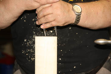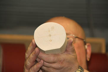 Der Klotz hat einen rechteckigen Zuschnitt. Zur schmalen Seite hin hat Martin vom Mittelpunkt aus nach links und rechts zwei Punkte markiert. Ca. 1 cm vom Mittelpunkt entfernt. |