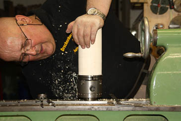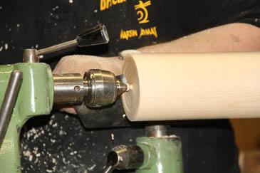 Die Reitstockspitze kommt raus und das Bohrfutter mit dem nagelneuen ZOBO-Bohrer kommt rein. |