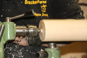 Damit später alles rund läuft, hat er die Markierung mit einem 3 mm-Bohrer etwas vorgebohrt. So verläuft die Reitstockspitze nicht.