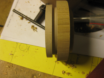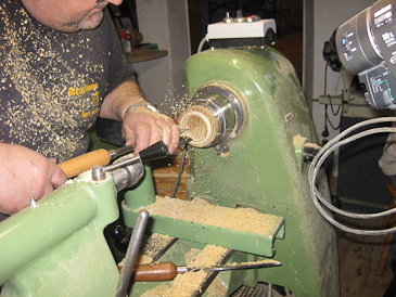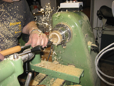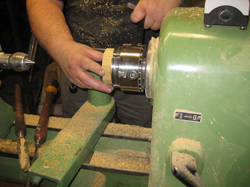 Die Dose wird mit einem passenden Forstnerbohrer ausgebohrt. Dann wird mit dem Meissel ein Falz für den Innengewindering angedreht. |