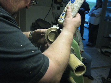 Nun wird der Deckel auf die Dose geschraubt. Der Gewindering in der Dose ist noch nicht eingeklebt, weil nun genau der Faserverlauf von Dose und Deckel bestimmt werden muss. |