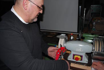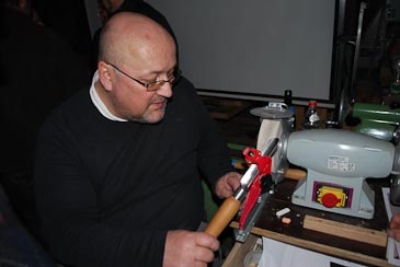 Er demonstriert die Anwendung des Woodcut Schärfsystems auf den von ihm umgebauten und optimierten Optigrind-Schleifböcken. |