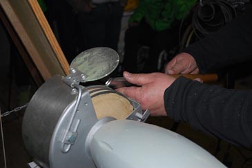 Hier zieht Martin nun die geschärfte Röhre auf einer Multiplex-Scheibe mit Poliermittel ab. |