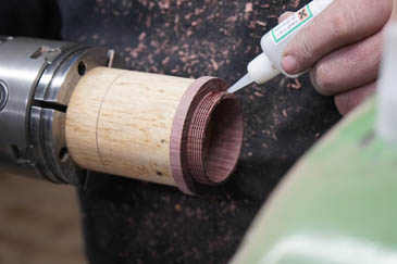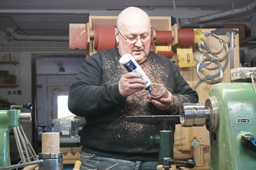 Um für den letzten Gewindeschnitt das Holz noch zu stabilisieren, trägt Martin etwas Sekundenkleber auf und beschleunigt mit dem Aktivator. |