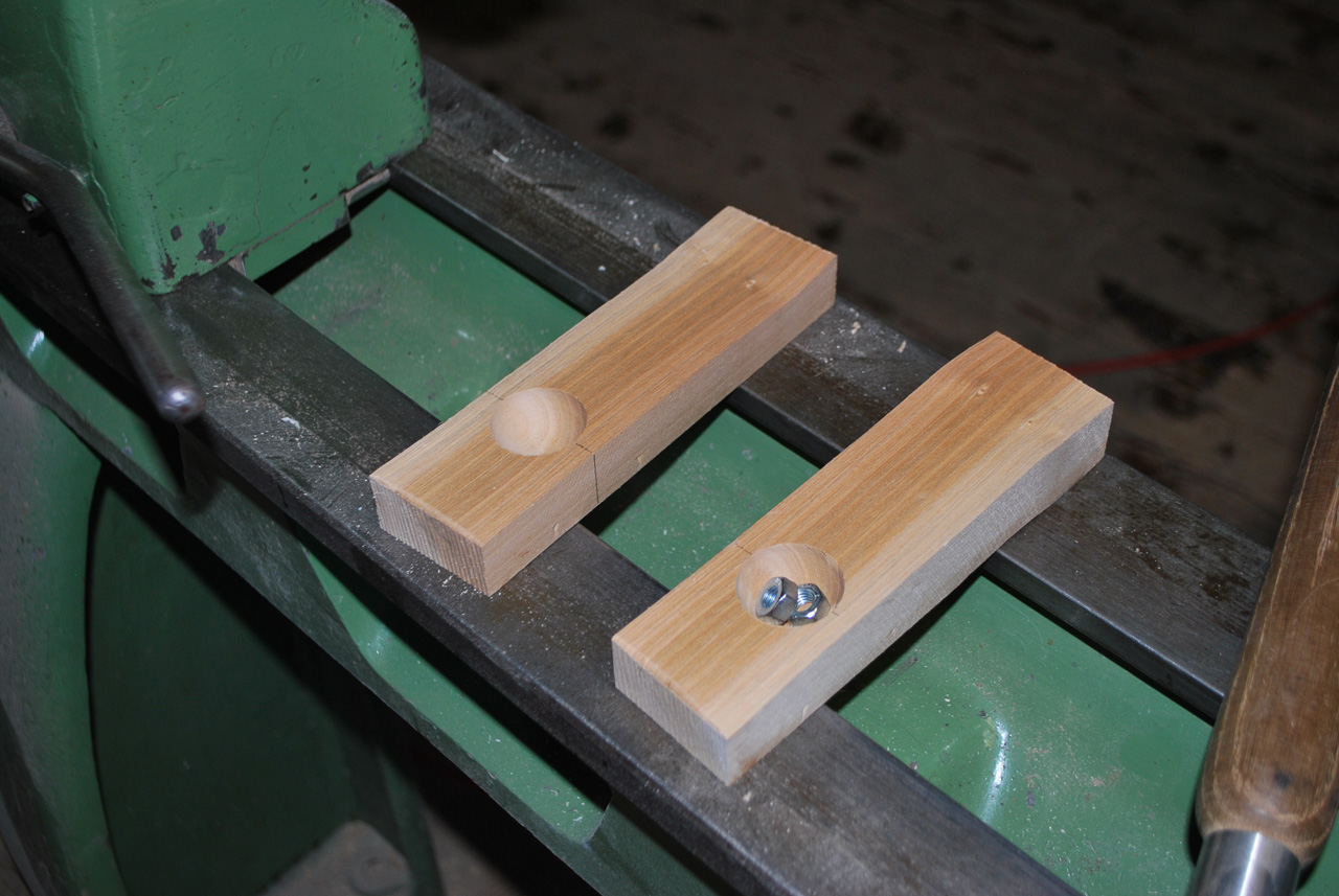 Die beiden halbkugelförmigen Aushöhlungen ergeben jetzt die innere Form der Rassel. Damit es auch (zur Freude der Eltern) etwas rasselt, werden kleine "Klangerzeuger" in das innere der Rassel eingebracht. Martin verwendet hier Muttern. Es können aber auch getrocknete Erbsen oder Maiskörner verwendet werden.
