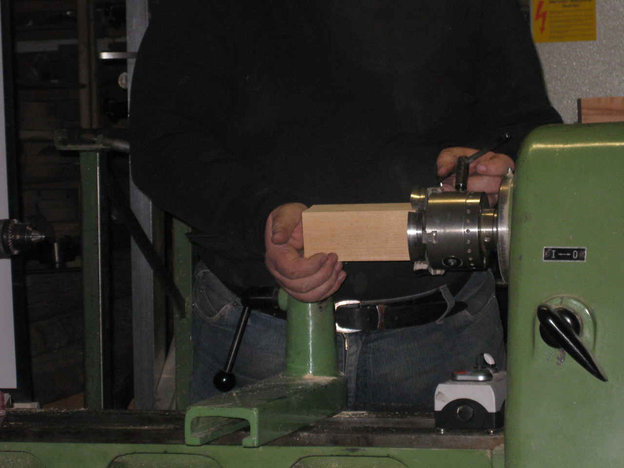 Und es geht nun darum, die Maserung exakt auszurichten, so dass dann das Gewinde im Oberteil genau passend eingeklebt werden kann. |