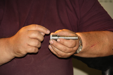Martin zeigt, was er heute Großes vor hat: Flaschenstopfen in Metall und Kork.