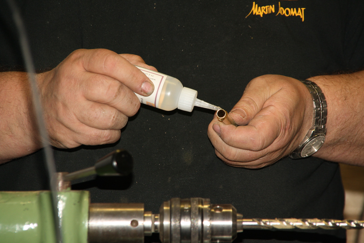 Für eine sichere Klebung ist es empfehlenswert, zuerst in die Bohrung im Pen blank etwas Kleber ringförmig aufzutragen.