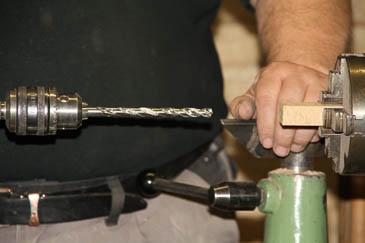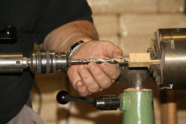 Der Pen plank wird in das Vier-Backen-Futter gespannt, um dann die Bohrung für das Messingröhrchen des Bausatzes einzukleben. |