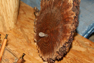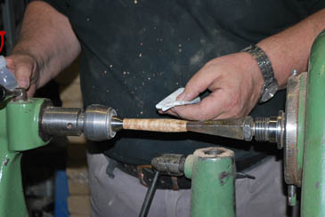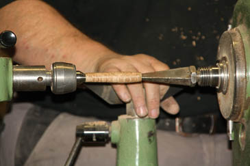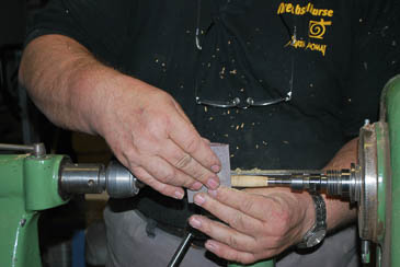 Da Schreibgeräte einer starken Belastung durch Handschweiß ausgesetzt sind, sollte die Oberfläche gut versiegelt werden. Martin hat dazu den Rohling zwischen einen alte Vierzackmitnehmer und einer mitlaufenden Reitstockspitze gespannt. |