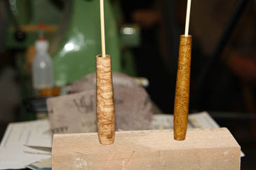 Eine sorgfältige Verklebung ist extrem wichtig, da das Holz oftmals nur noch ca. 1 mm stark ist, wenn der Schreiber fertig gedrechselt und geschliffen ist.