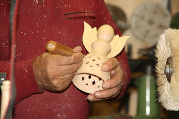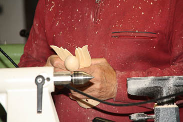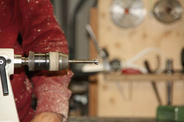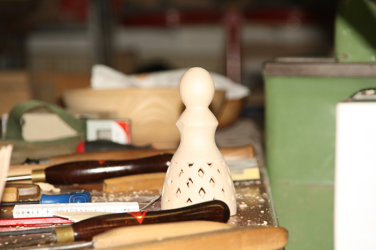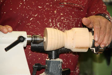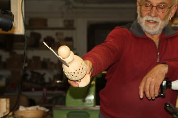 Der Unterteil ist fertig gedrechselt. Jetzt kommt der Zapfen für die Christbaumspitze dran. Reinhard hat so ein Teil schon vorbereitet. |